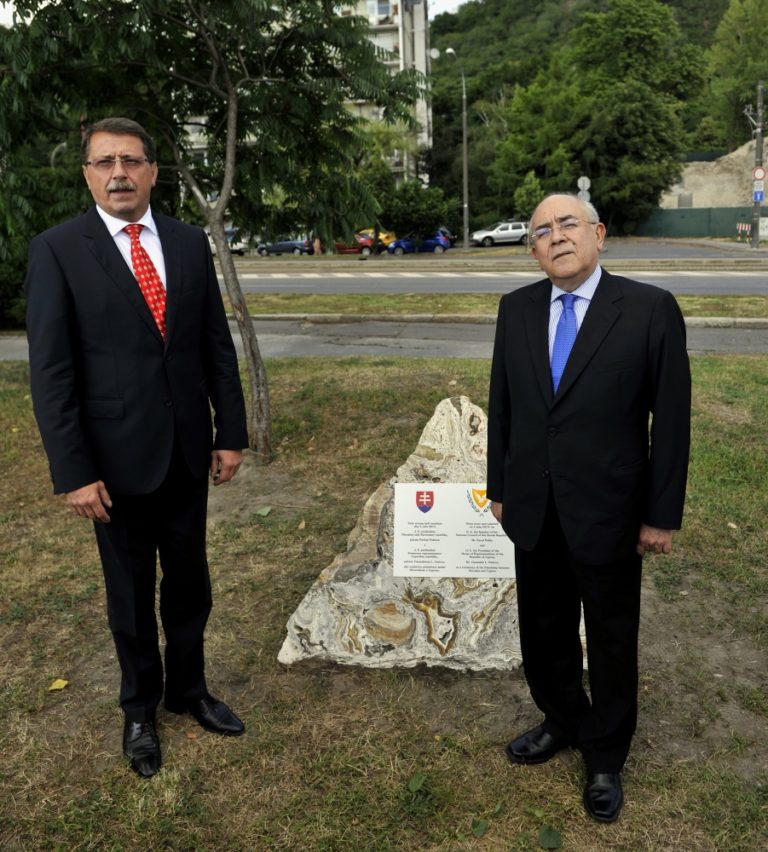 Predseda NR SR Pavol Paška (vpravo) a predseda Snemovne reprezentantov Cyperskej republiky Yiannakis L. Omirou počas výsadby cyperských platanov a odhalenia pamätnej tabule. Bratislava, 3. júl 2014. Foto: SITA/Ján Slovák