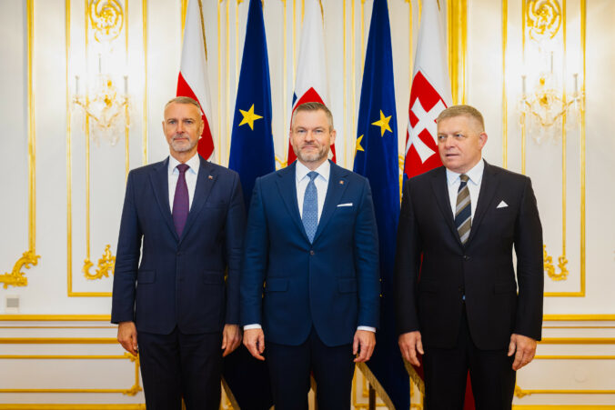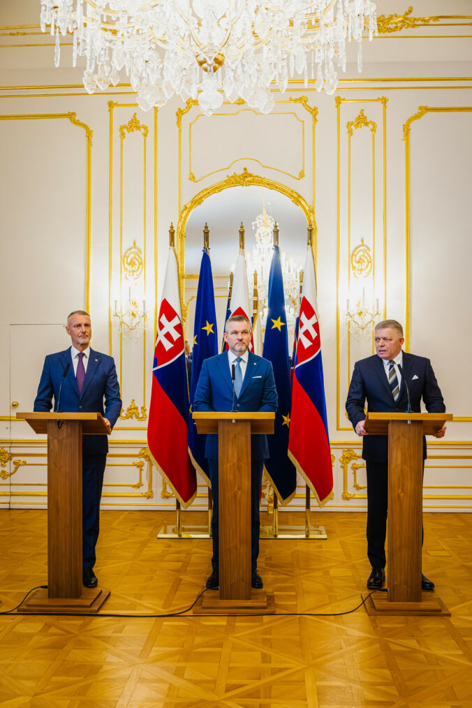 Zľava: Predseda Národnej rady SR Richard Raši, prezident SR Peter Pellegrini, a premiér SR Robert Fico počas tlačovej konferencie v rámci stretnutia troch najvyšších ústavných činiteľov na Bratislavskom hrade. Bratislava, 10. január 2026. Foto: SITA/Kancelária prezidenta SR