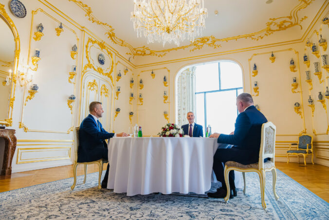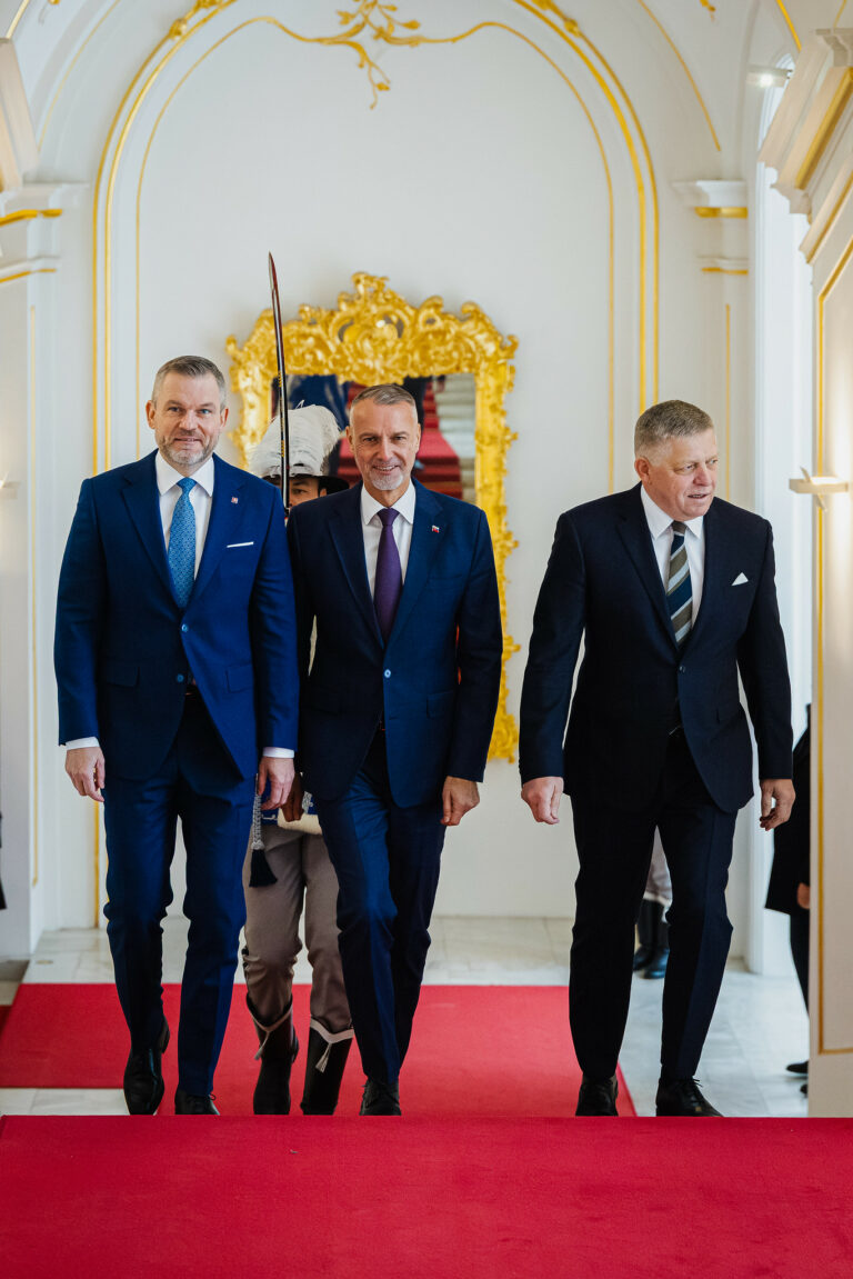Zľava: Predseda Národnej rady SR Richard Raši, prezident SR Peter Pellegrini, a premiér SR Robert Fico počas stretnutia troch najvyšších ústavných činiteľov na Bratislavskom hrade. Bratislava, 10. január 2026. Foto: SITA/Kancelária prezidenta SR