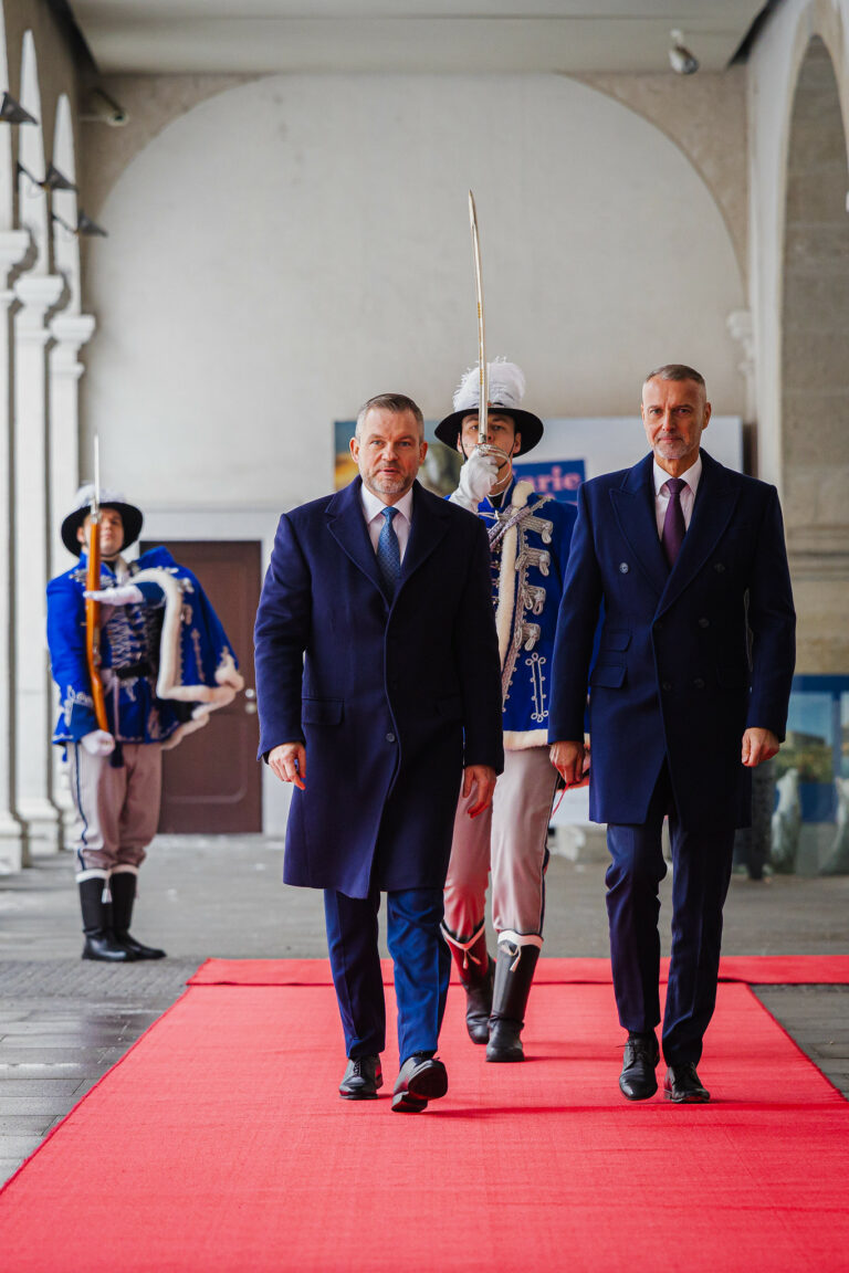 V popredí zľava: Prezident SR Peter Pellegrini a predseda Národnej rady SR Richard Raši počas stretnutia troch najvyšších ústavných činiteľov na Bratislavskom hrade. Bratislava, 10. január 2026. Foto: SITA/Kancelária prezidenta SR