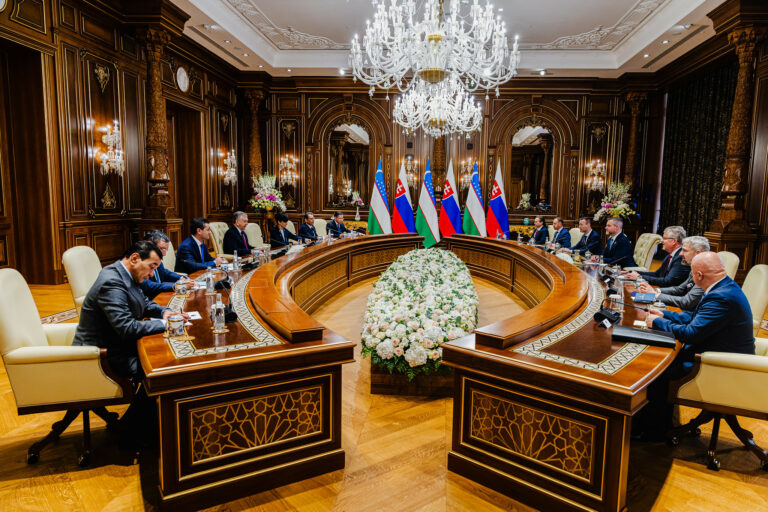 Zľava: Prezident SR Peter Pellegrini a prezident Uzbekistanu Shavkat Mirziyoyev počas stretnutia v rámci 43. zasadnutia Generálnej konferencie UNESCO v Samarkande v Uzbekistane pri príležitosti 80. výročia založenia UNESCO. Uzbekistan, Samarkand, 29. október 2025. Foto: SITA/Kancelária prezidenta