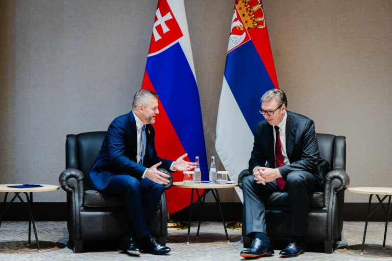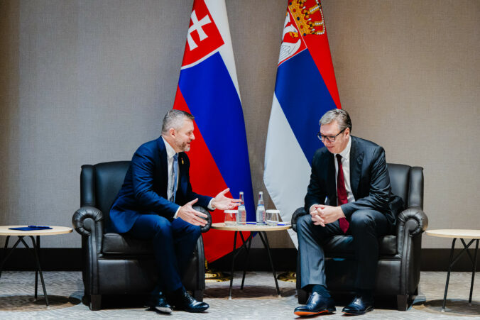 Zľava: Prezident SR Peter Pellegrini a prezident Srbska Aleksandar Vučić počas stretnutia v rámci 43. zasadnutia Generálnej konferencie UNESCO v Samarkande v Uzbekistane pri príležitosti 80. výročia založenia UNESCO. Uzbekistan, Samarkand, 29. október 2025. Foto: SITA/Kancelária prezidenta