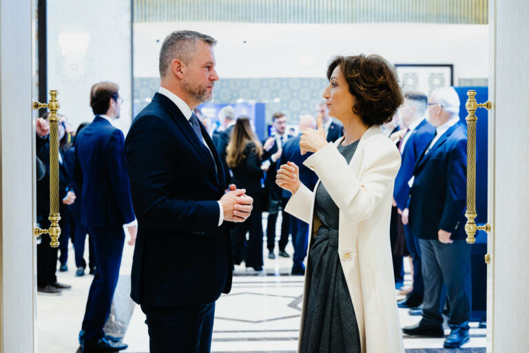 Zľava v popredí: Prezident SR Peter Pellegrini a  generálna riaditeľka UNESCO Audrey Azoulayová počas 43. zasadnutia Generálnej konferencie UNESCO v Samarkande v Uzbekistane pri príležitosti 80. výročia založenia UNESCO. Uzbekistan, Samarkand, 30. október 2025. Foto: SITA/Kancelária prezidenta