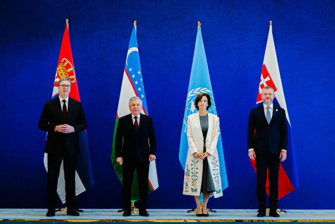 Zľava: Prezident Srbska Aleksandar Vučić, prezident Uzbekistanu Shavkat Mirziyoyev, generálna riaditeľka UNESCO Audrey Azoulayová a prezident SR Peter Pellegrini počas 43. zasadnutia Generálnej konferencie UNESCO v Samarkande v Uzbekistane pri príležitosti 80. výročia založenia UNESCO. Uzbekistan, Samarkand, 30. október 2025. Foto: SITA/Kancelária prezidenta