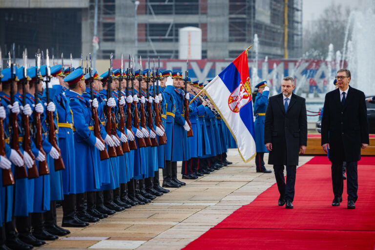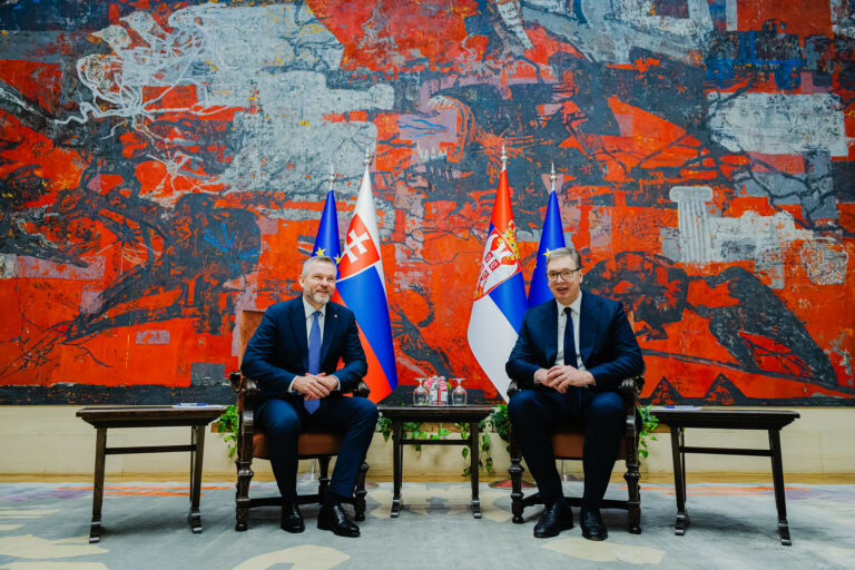 Zľava: Prezident SR Peter Pellegrini a prezident Srbska Aleksandar Vučić počas prijatia prezidenta SR prezidentom Srbska v Paláci Srbska v Belehrade v rámci oficiálnej návštevy prezidenta Slovenskej republiky v Srbskej republike. Belehrad, Srbsko, 21. december 2025. Foto: SITA/Kancelária prezidenta SR