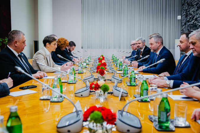 Prezident SR Peter Pellegrini (tretí sprava) a predsedníčka Národného zhromaždenia Ana Brnabić (druhá zľava) počas rokovania v Paláci Srbska v Belehrade v rámci oficiálnej návštevy prezidenta Slovenskej republiky v Srbskej republike. Belehrad, Srbsko, 21. december 2025. Foto: SITA/Kancelária prezidenta SR