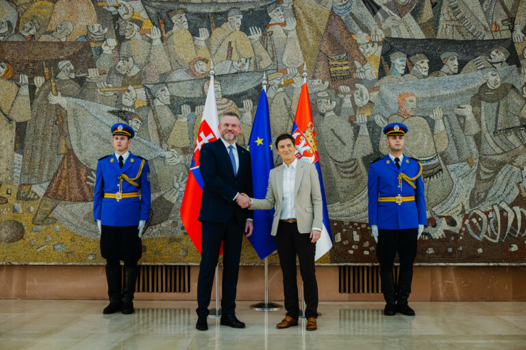 Uprostred zľava: Prezident SR Peter Pellegrini a predsedníčka Národného zhromaždenia Ana Brnabić počas stretnutia v Paláci Srbska v Belehrade v rámci oficiálnej návštevy prezidenta Slovenskej republiky v Srbskej republike. Belehrad, Srbsko, 21. december 2025. Foto: SITA/Kancelária prezidenta SR