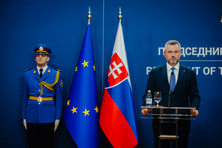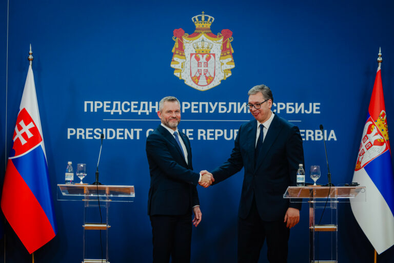 Prezident SR Peter Pellegrini (vpravo) počas tlačovej konferencie po prijatí prezidenta SR prezidentom Srbska v Paláci Srbska v Belehrade v rámci oficiálnej návštevy prezidenta Slovenskej republiky v Srbskej republike. Belehrad, Srbsko, 21. december 2025. Foto: SITA/Kancelária prezidenta SR
