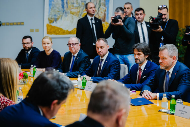 Sprava: Prezident SR Peter Pellegrini a minister obrany SR Robert Kliňák počas rokovania prezidentov Slovenska a Srbska v Paláci Srbska v Belehrade v rámci oficiálnej návštevy prezidenta Slovenskej republiky v Srbskej republike. Belehrad, Srbsko, 21. december 2025. Foto: SITA/Kancelária prezidenta SR
