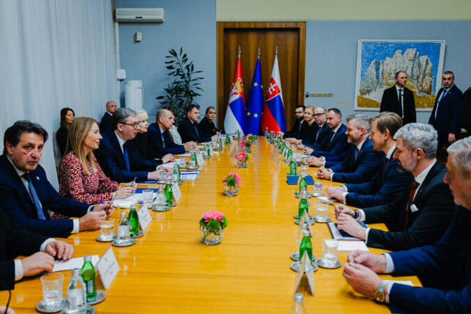 Prezident SR Peter Pellegrini (štvrtý sprava) a prezident Srbska Aleksandar Vučić (tretí zľava) počas rokovania prezidentov Slovenska a Srbska v Paláci Srbska v Belehrade v rámci oficiálnej návštevy prezidenta Slovenskej republiky v Srbskej republike. Belehrad, Srbsko, 21. december 2025. Foto: SITA/Kancelária prezidenta SR