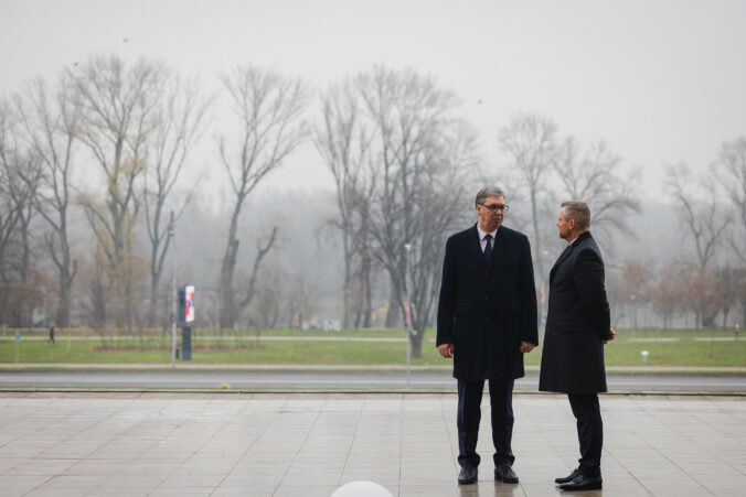 Sprava: Prezident Srbska Aleksandar Vučić a prezident SR Peter Pellegrini počas prijatia prezidenta Slovenska prezidentom Srbska v Paláci Srbska v Belehrade v rámci oficiálnej návštevy prezidenta Slovenskej republiky v Srbskej republike. Belehrad, Srbsko, 21. december 2025. Foto: SITA/Kancelária prezidenta SR