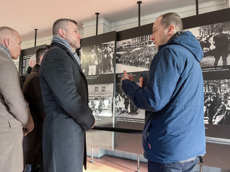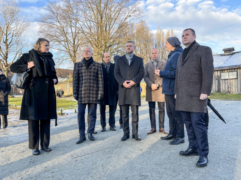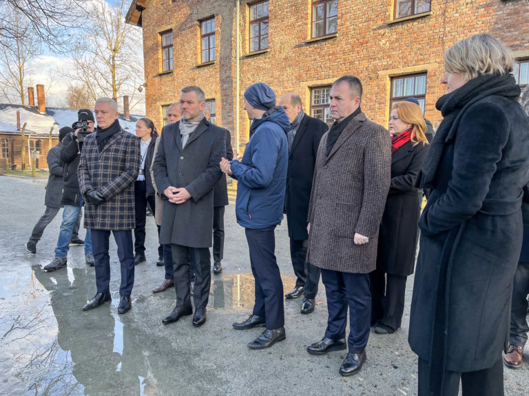 Predseda Národnej rady SR Peter Pellegrini (šiesty zľava) počas návštevy koncentračného tábora Auschwitz-Birkenau v Poľsku. Krakov, 23. január 2024. Foto: SITA/Kristína Valovičová