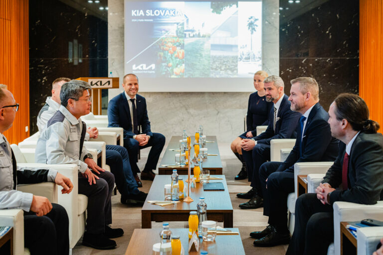 Prezident SR Peter Pellegrini (druhý sprava) počas stretnutia s vedením závodu spoločnosti Kia Motors Slovakia v Tepličke nad Váhom. Teplička nad Váhom, 6. november 2024. Foto: SITA/Kancelária prezidenta SR