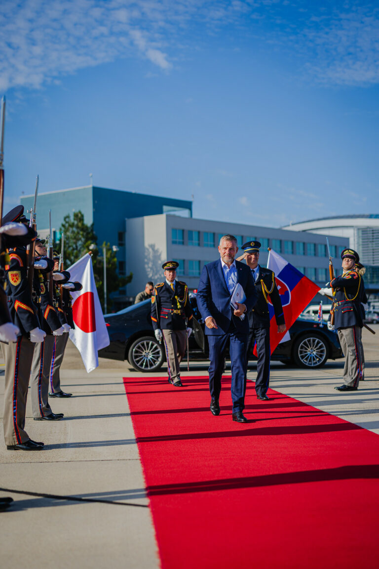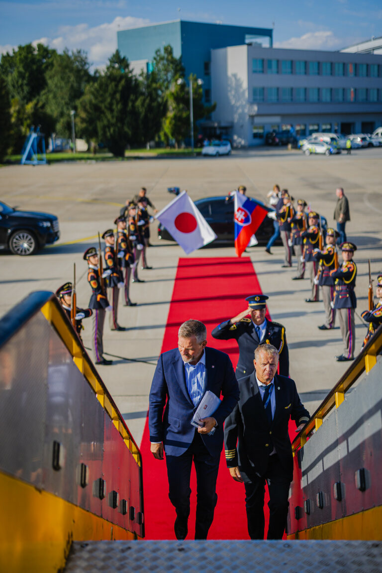 Prezident SR Peter Pellegrini (v popredí vpravo) pred odletom do Japonska pri príležitosti osláv Národného dňa Slovenskej republiky na svetovej výstave EXPO 2025, ktorá sa koná v Osake. Slovensko, 8. september 2025. Foto: SITA/Kancelária prezidenta SR
