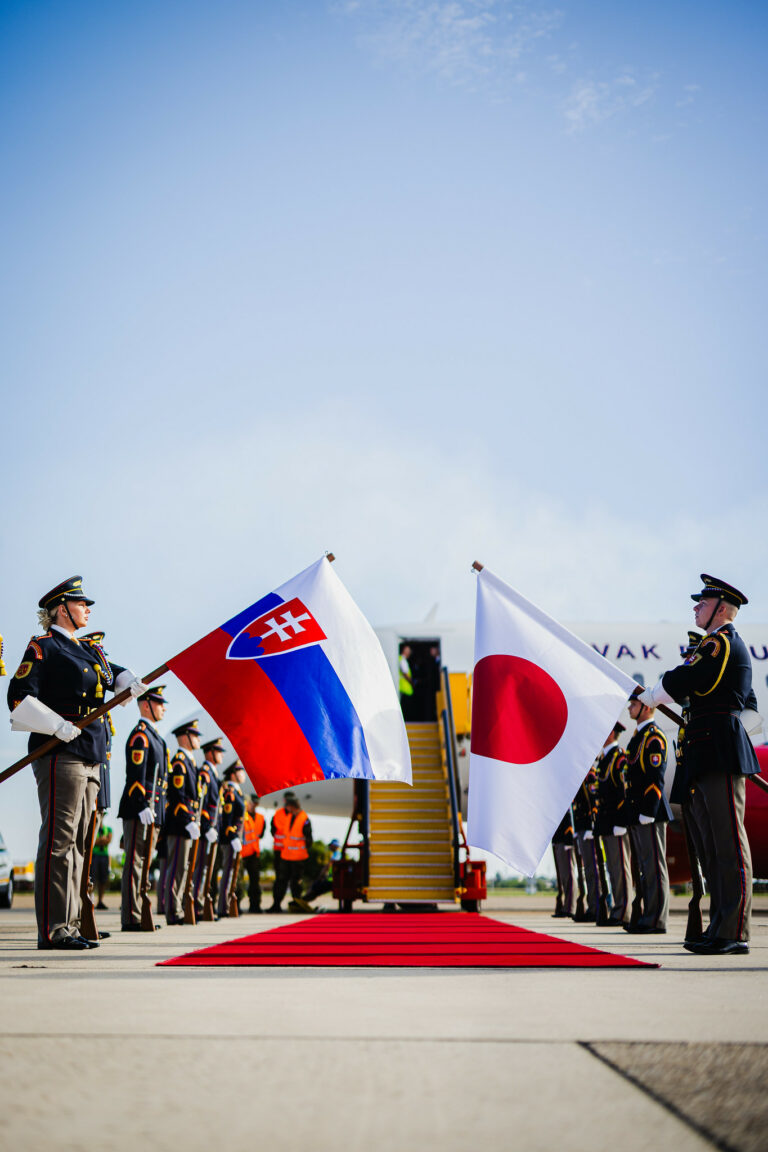 Čestná stráž prezidenta SR drží vlajky Slovenskej republiky a Japonska pred odletom prezidenta SR do Japonska pri príležitosti osláv Národného dňa Slovenskej republiky na svetovej výstave EXPO 2025, ktorá sa koná v Osake. Slovensko, 8. september 2025. Foto: SITA/Kancelária prezidenta SR