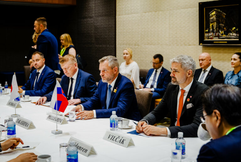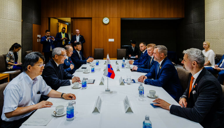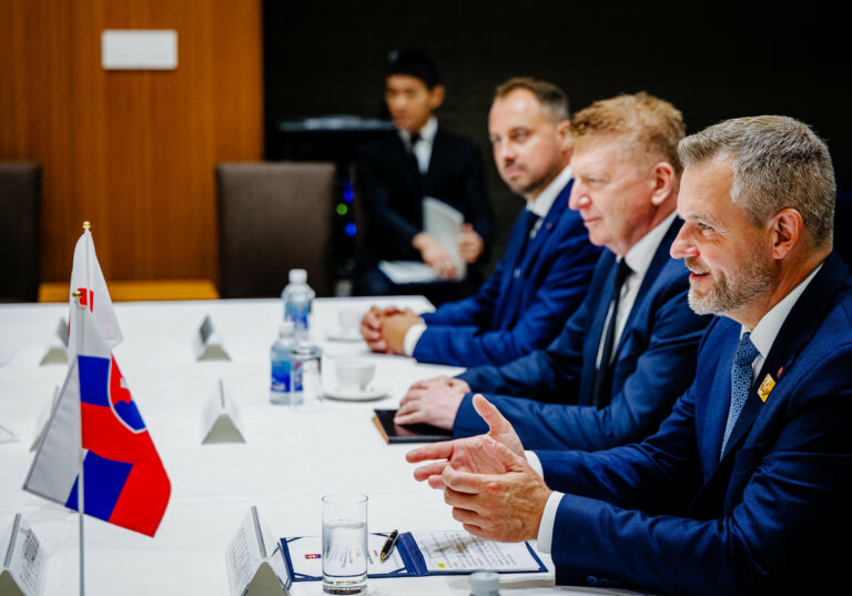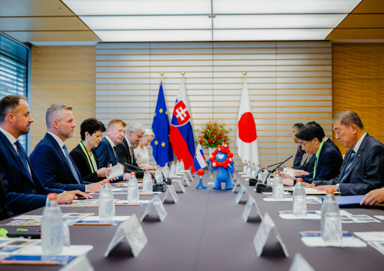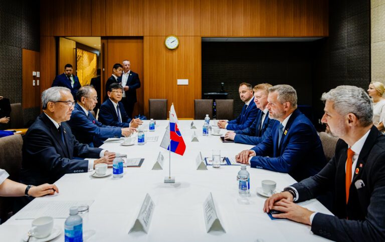 Prezident SR Peter Pellegrini (vpravo) počas rokovania so zástupcami Keidanren a premiérom Japonska pri príležitosti jeho návštevy v Japonsku v rámci osláv Národného dňa Slovenskej republiky na Svetovej výstave EXPO 2025 v Osake. Japonsko, 9. september 2025. Foto: SITA/Kancelária prezidenta SR