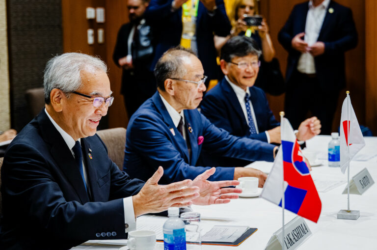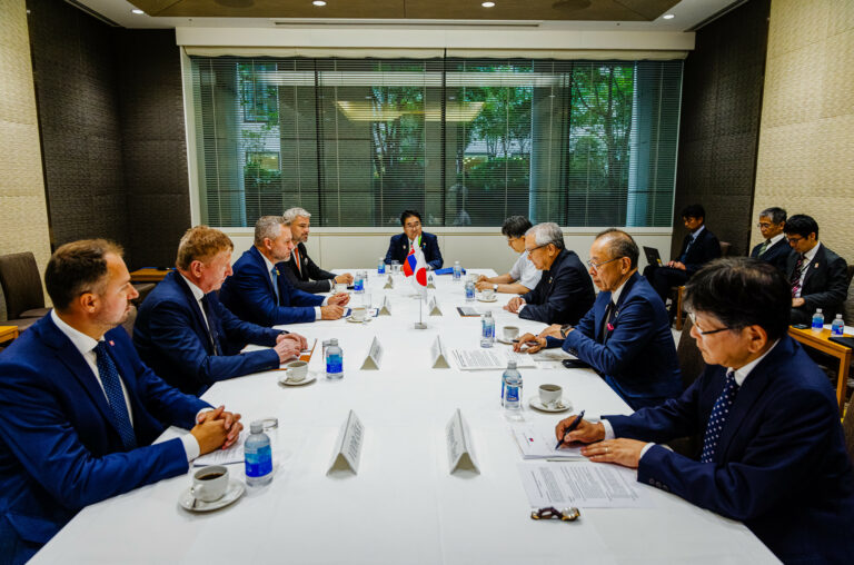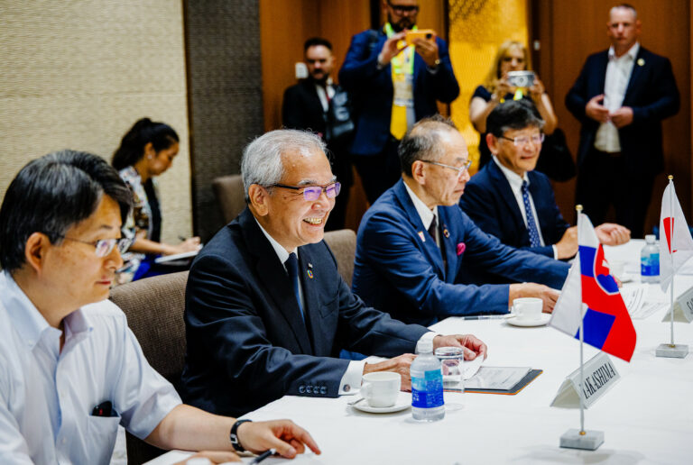 Viceprezident obchodnej komory Keidanren Makoto Takashima (druhý zľava) počas rokovania s prezidentom SR pri príležitosti návštevy Japonska prezidentom SR v rámci osláv Národného dňa Slovenskej republiky na Svetovej výstave EXPO 2025 v Osake. Japonsko, 9. september 2025. Foto: SITA/Kancelária prezidenta SR