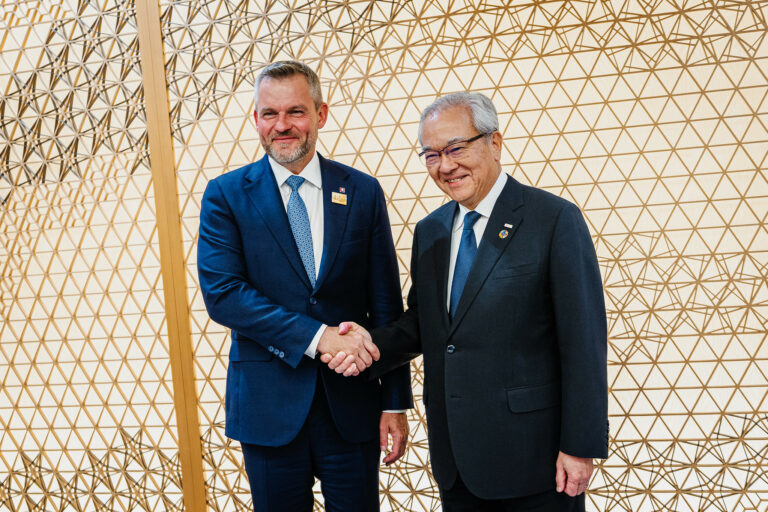 Zľava: Prezident SR Peter Pellegrini a viceprezident obchodnej komory Keidanren Makato Takashima počas návštevy Japonska prezidentom SR pri príležitosti osláv Národného dňa Slovenskej republiky na svetovej výstave EXPO 2025, ktorá sa koná v Osake. Japonsko, 9. september 2025. Foto: SITA/Kancelária prezidenta SR