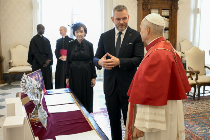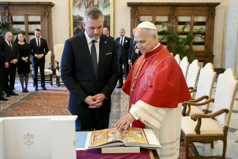 Zľava: Pápež Lev XIV. a prezident SR Peter Pellegrini počas osobnej audiencie vo Vatikáne. Vatikán, 4. december 2025. Foto: SITA/Kancelária prezidenta SR