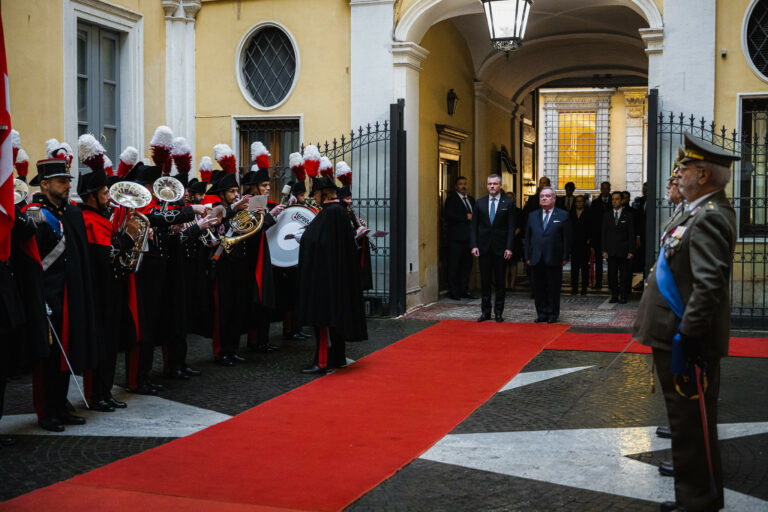 Uprostred sprava: Veľmajster rádu Fra' John Timothy Dunlap a prezident SR Peter Pellegrini počas prijatia v rámci návštevy Zvrchovaného rádu Maltézskych rytierov v Magistrálnom paláci v Ríme. Rím, 5. december 2025. Foto: SITA/Kancelária prezidenta SR