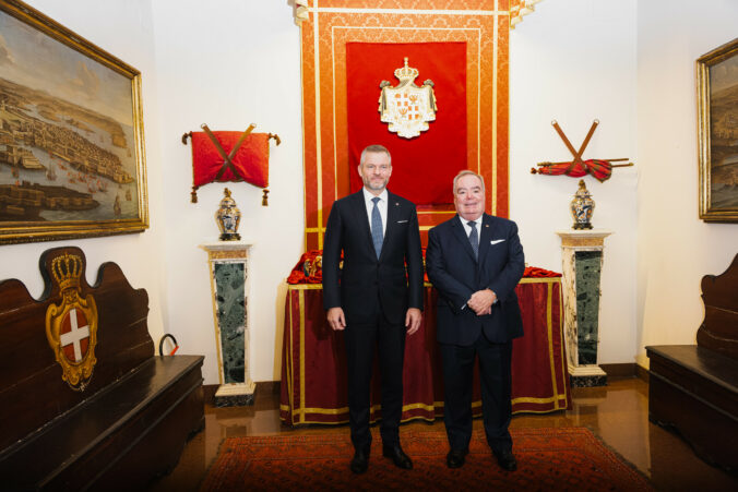 Sprava: Veľmajster rádu Fra' John Timothy Dunlap a prezident SR Peter Pellegrini počas prijatia v rámci návštevy Zvrchovaného rádu Maltézskych rytierov v Magistrálnom paláci v Ríme. Rím, 5. december 2025. Foto: SITA/Kancelária prezidenta SR