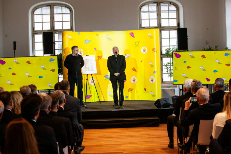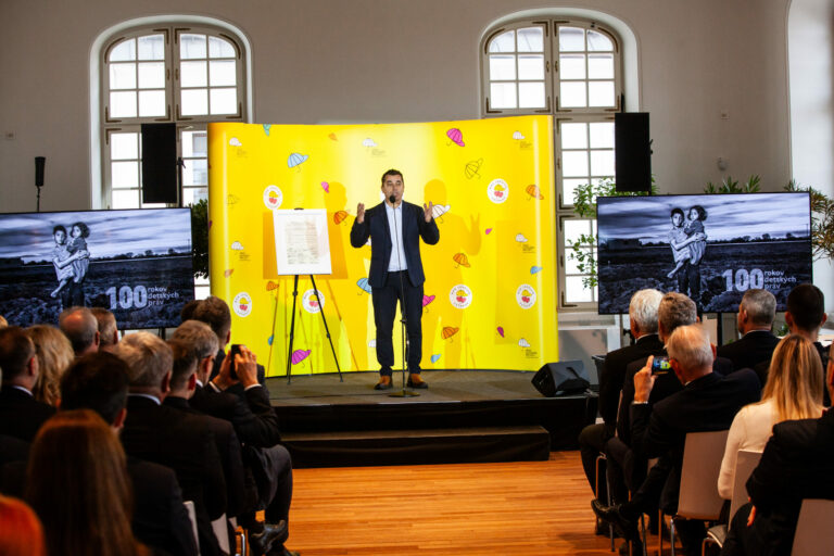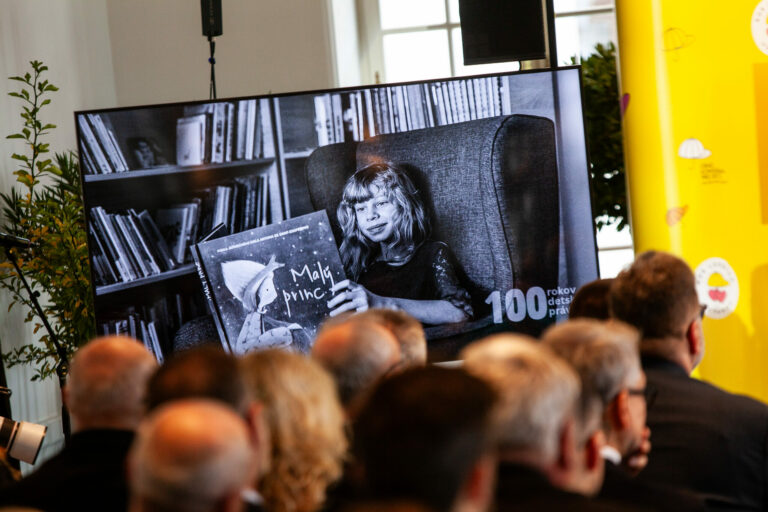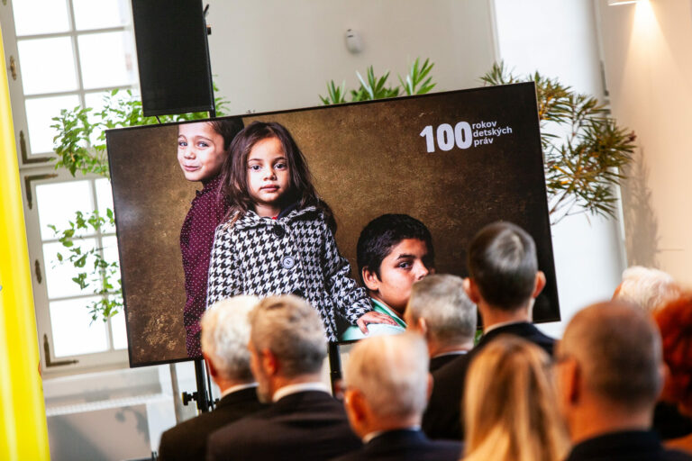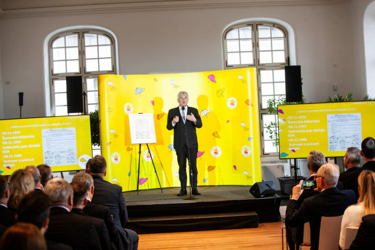 Komisár pre deti Jozef Mikloško (uprostred) počas prejavu na podujatí Oslava 100. výročia práv detí organizovaného Úradom komisára pre deti pri príležitosti Svetového dňa detí - UNICEF v priestoroch záhradného pavilónu Bratislavského hradu. Bratislava, 20. november 2024. Foto: SITA/Bokor Tomáš