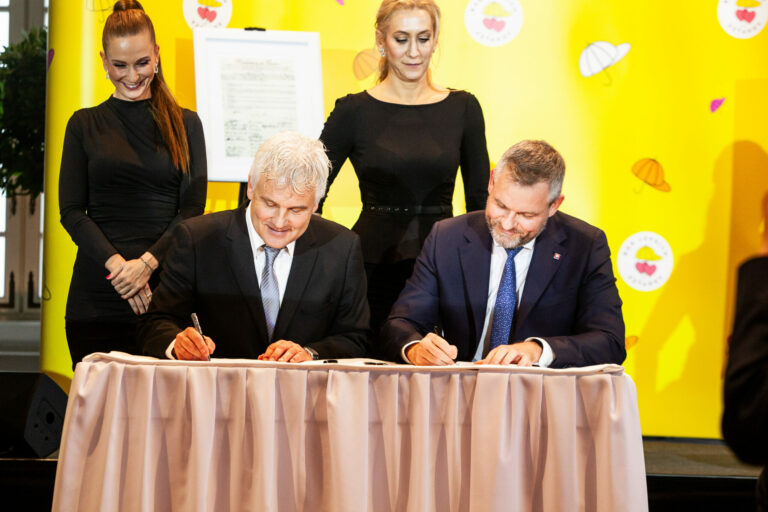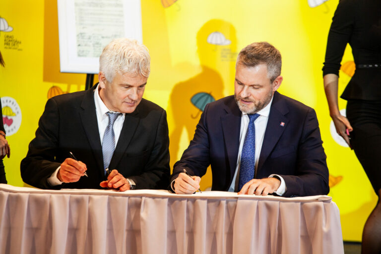 Zľava: Komisár pre deti Jozef Mikloško a prezident SR Peter Pellegrini počas podujatia Oslava 100. výročia práv detí organizovaného Úradom komisára pre deti pri príležitosti Svetového dňa detí - UNICEF v priestoroch záhradného pavilónu Bratislavského hradu. Bratislava, 20. november 2024. Foto: SITA/Bokor Tomáš