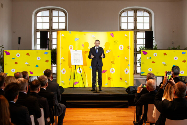 Prezident SR Peter Pellegrini (uprostred) počas prejavu na podujatí Oslava 100. výročia práv detí organizovaného Úradom komisára pre deti pri príležitosti Svetového dňa detí - UNICEF v priestoroch záhradného pavilónu Bratislavského hradu. Bratislava, 20. november 2024. Foto: SITA/Bokor Tomáš