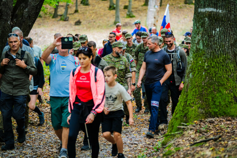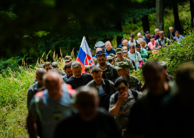 Prezident SR Peter Pellegrini (v popredí vpravo) počas 37. ročníka turistického pochodu partizánskym chodníkom z obce Skýcov do obce Zlatno a v rámci 81. výročia Slovenského národného povstania (SNP) si položením vencov pri pamätníkoch SNP uctil odvahu hrdinov povstania ako aj obete druhej svetovej vojny. Skýcov/Zlatno, 23. august 2025. Foto: SITA/Kancelária prezidenta SR