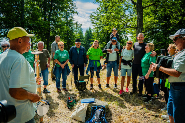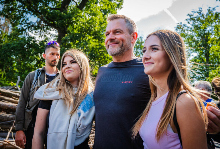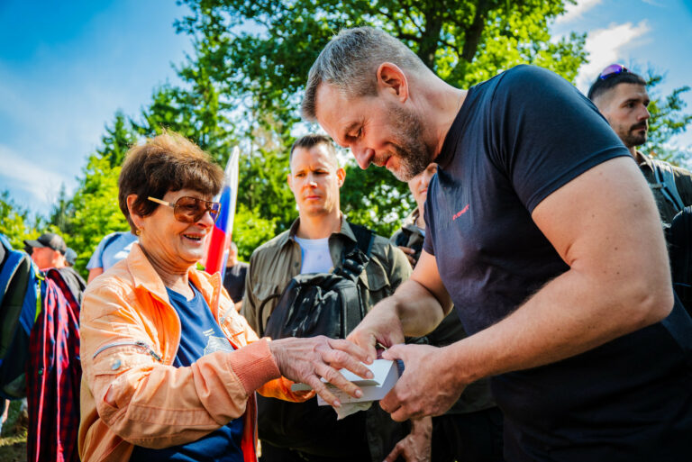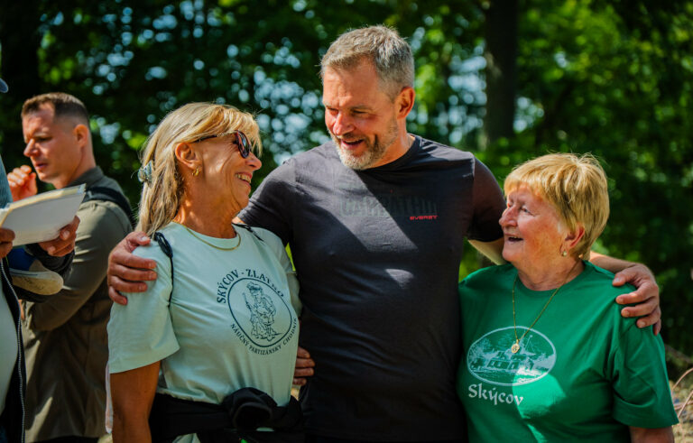 Prezident SR Peter Pellegrini (uprostred) počas 37. ročníka turistického pochodu partizánskym chodníkom z obce Skýcov do obce Zlatno a v rámci 81. výročia Slovenského národného povstania (SNP) si položením vencov pri pamätníkoch SNP uctil odvahu hrdinov povstania ako aj obete druhej svetovej vojny. Skýcov/Zlatno, 23. august 2025. Foto: SITA/Kancelária prezidenta SR