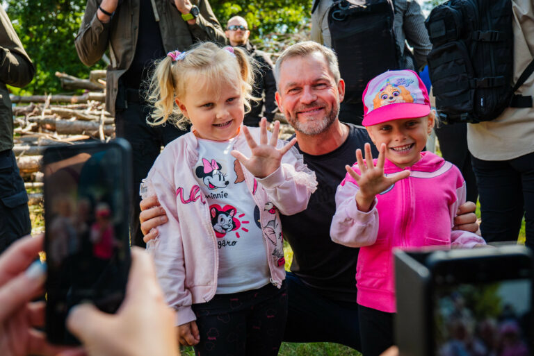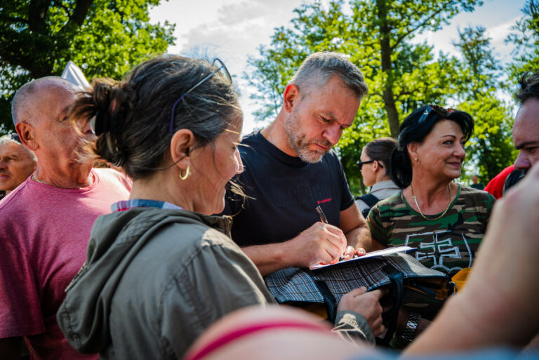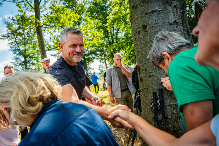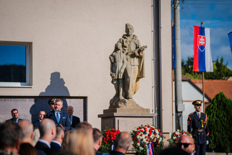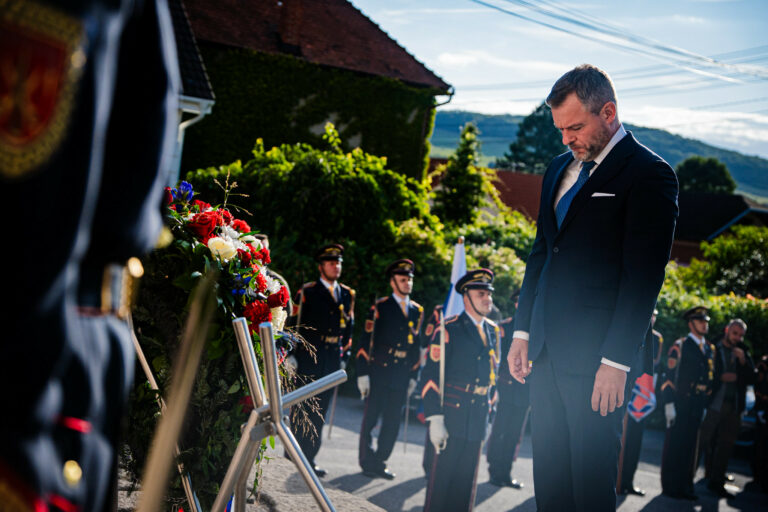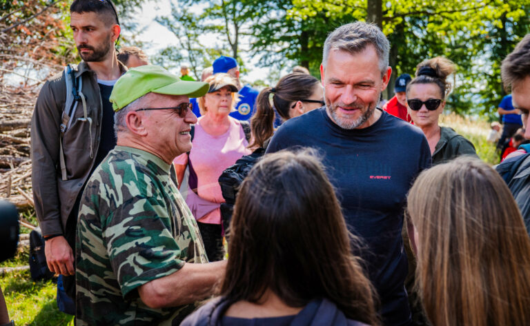 Prezident SR Peter Pellegrini počas 37. ročníka turistického pochodu partizánskym chodníkom z obce Skýcov do obce Zlatno a v rámci 81. výročia Slovenského národného povstania (SNP) si položením vencov pri pamätníkoch SNP uctil odvahu hrdinov povstania ako aj obete druhej svetovej vojny. Skýcov/Zlatno, 23. august 2025. Foto: SITA/Kancelária prezidenta SR