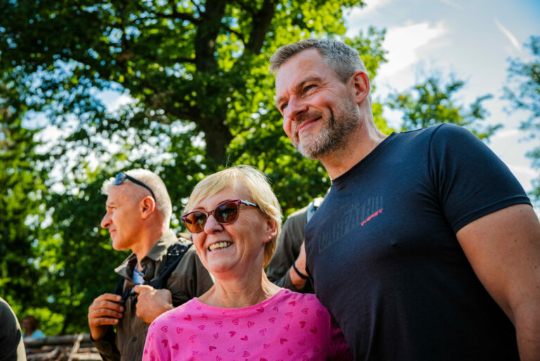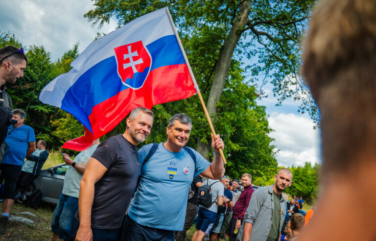 Prezident SR Peter Pellegrini (vpravo) počas 37. ročníka turistického pochodu partizánskym chodníkom z obce Skýcov do obce Zlatno a v rámci 81. výročia Slovenského národného povstania (SNP) si položením vencov pri pamätníkoch SNP uctil odvahu hrdinov povstania ako aj obete druhej svetovej vojny. Skýcov/Zlatno, 23. august 2025. Foto: SITA/Kancelária prezidenta SR