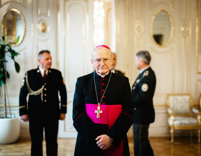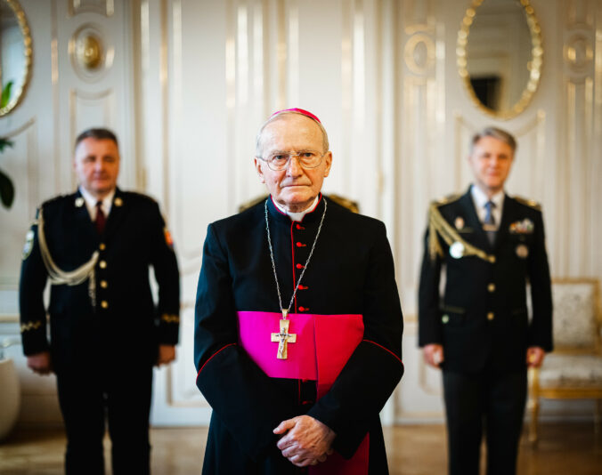 Mons. František Rábek (v popredí) počas odovzdania ďakovnej medaily prezidentom SR v Prezidentskom paláci pri príležitosti ukončenia 22-ročného pôsobenia Františka Rábeka na poste prvého ordinára Ozbrojených síl a ozbrojených zborov SR. Bratislava, 17. október 2025. Foto: SITA/Kancelária prezidenta SR