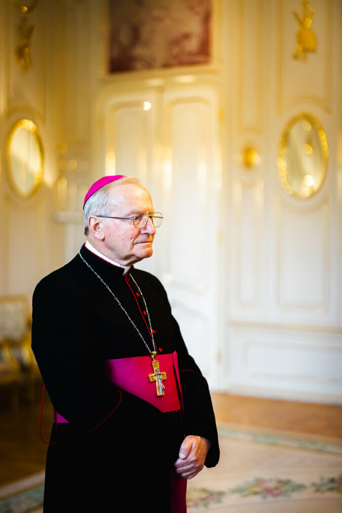 Mons. František Rábek počas odovzdania ďakovnej medaily prezidentom SR v Prezidentskom paláci pri príležitosti ukončenia 22-ročného pôsobenia Františka Rábeka na poste prvého ordinára Ozbrojených síl a ozbrojených zborov SR. Bratislava, 17. október 2025. Foto: SITA/Kancelária prezidenta SR