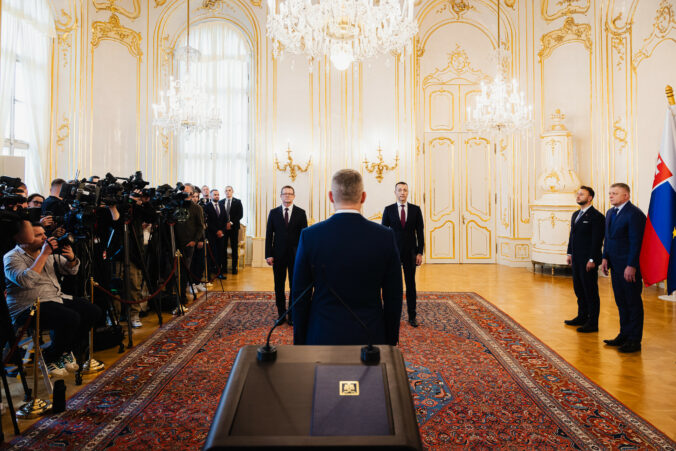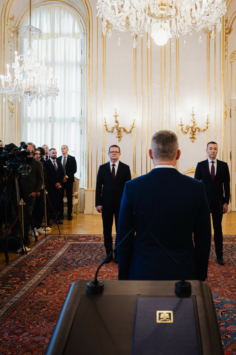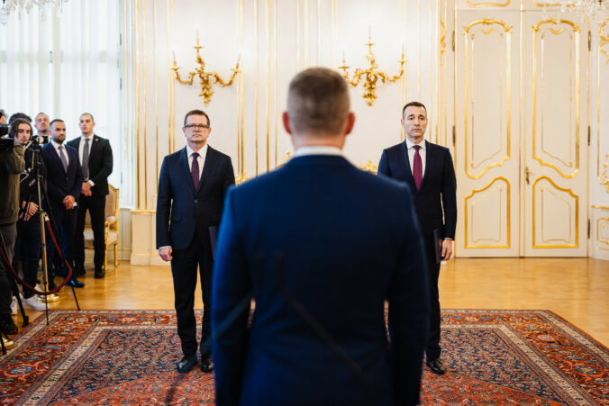 Sprava: Predseda vlády SR Robert Fico, minister vnútra SR Matúš Šutaj Eštok, minister školstva, výskumu, vývoja a mládeže SR Tomáš Drucker, prezident SR Peter Pellegrini a odchádzajúci podpredseda vlády SR pre Plán obnovy a znalostnú ekonomiku Peter Kmec počas prijatia demisie Petra Kmeca a dočasného vymenovania do jeho funkcie ministra školstva Tomáša Druckera v Prezidentskom paláci. Bratislava, 19. november 2025. Foto: SITA/Kancelária prezidenta SR