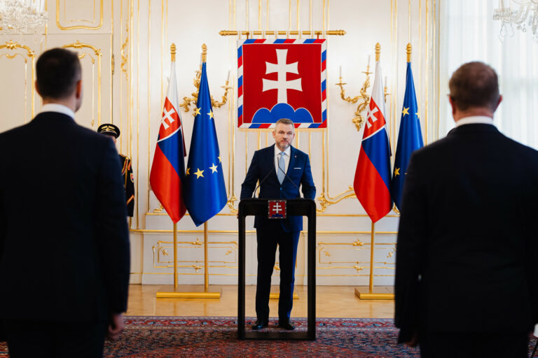 Prezident SR Peter Pellegrini a odchádzajúci podpredseda vlády SR pre Plán obnovy a znalostnú ekonomiku Peter Kmec počas prijatia demisie Petra Kmeca v Prezidentskom paláci. Bratislava, 19. november 2025. Foto: SITA/Kancelária prezidenta SR
