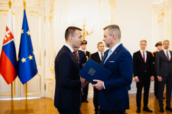 Zľava v popredí: Minister školstva, výskumu, vývoja a mládeže SR Tomáš Drucker a prezident SR Peter Pellegrini počas prijatia demisie vicepremiéra Petra Kmeca v Prezidentskom paláci a dočasného poverenia funkciou vicepremiéra ministra školstva Tomáša Druckera. Bratislava, 19. november 2025. Foto: SITA/Kancelária prezidenta SR