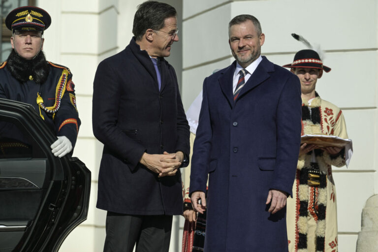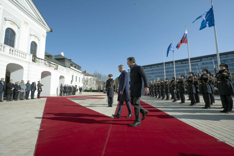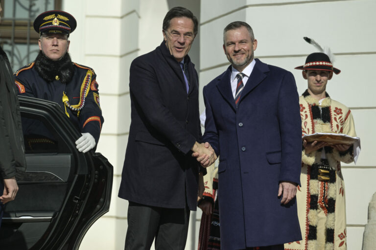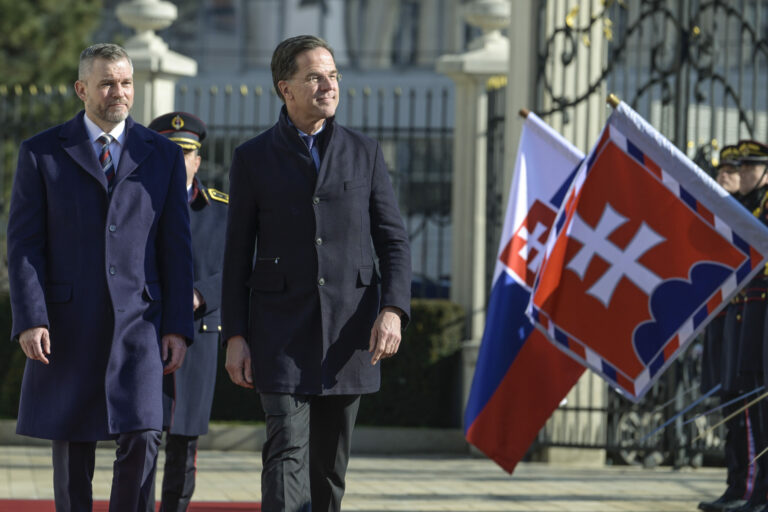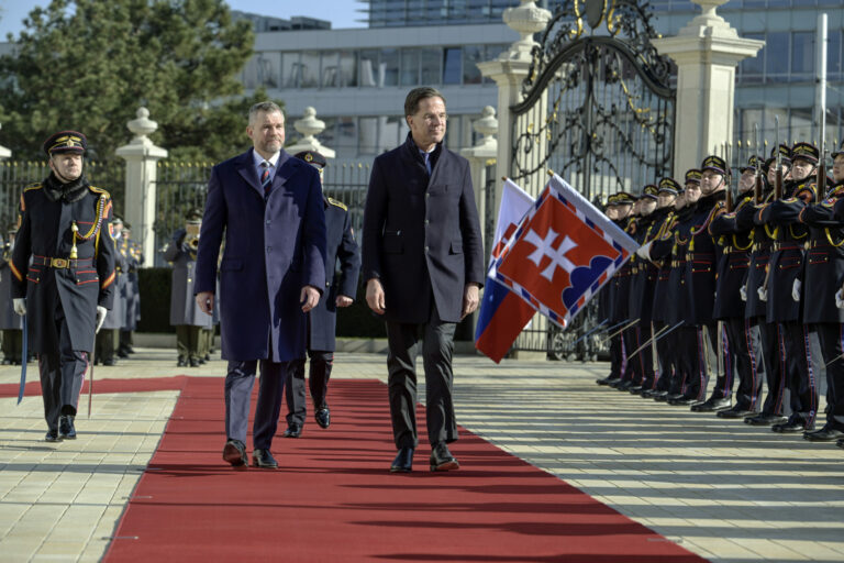 Sprava v popredí: Prezident SR Peter Pellegrini a generálny tajomník NATO Mark Rutte počas oficiálneho privítacieho ceremoniálu na nádvorí Prezidentského paláca v rámci prijatia generálneho tajomníka NATO prezidentom SR v Prezidentskom paláci. Bratislava, 20. február 2025. Foto: SITA/Milan Illík