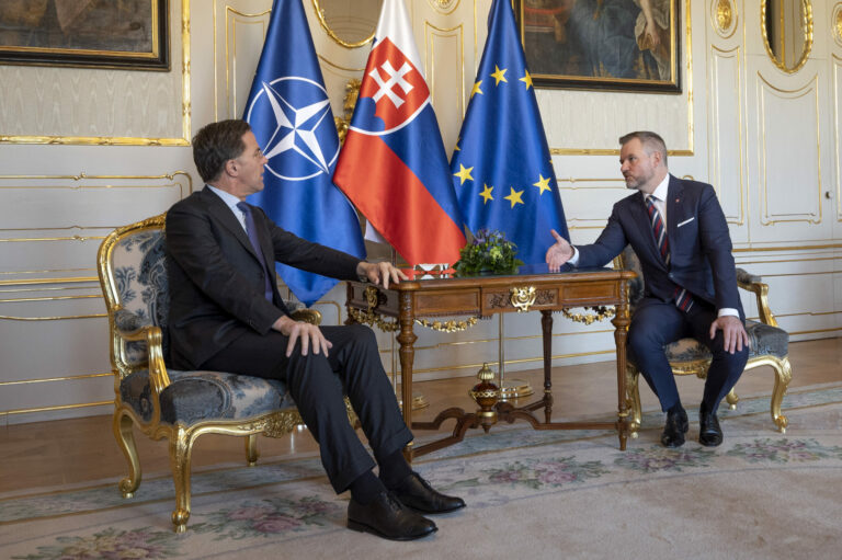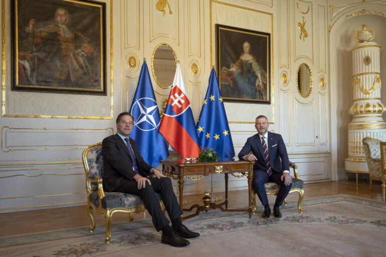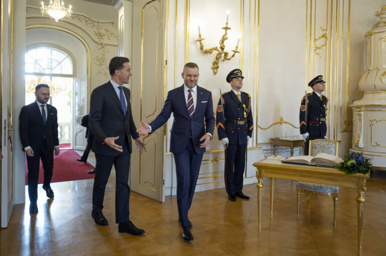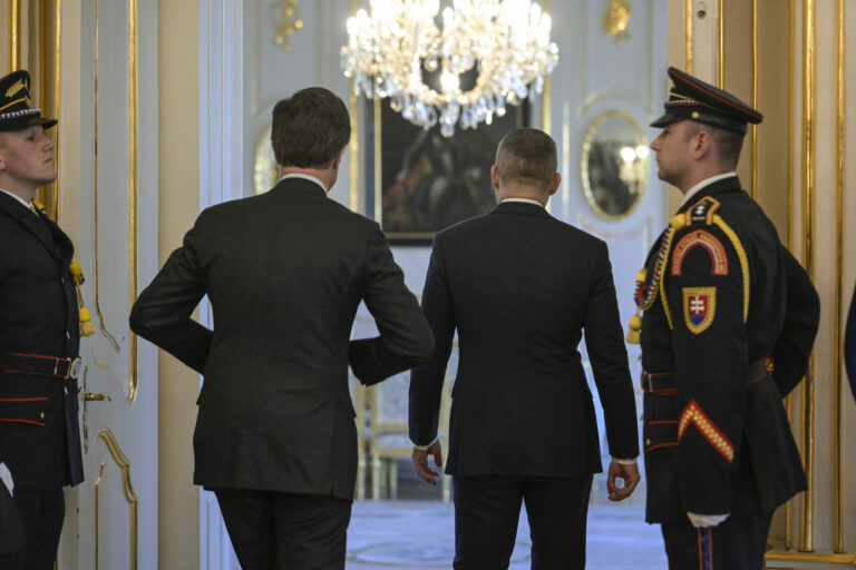 Sprava v popredí: Prezident SR Peter Pellegrini a generálny tajomník NATO Mark Rutte počas prijatia generálneho tajomníka NATO prezidentom SR v Prezidentskom paláci. Bratislava, 20. február 2025. Foto: SITA/Milan Illík