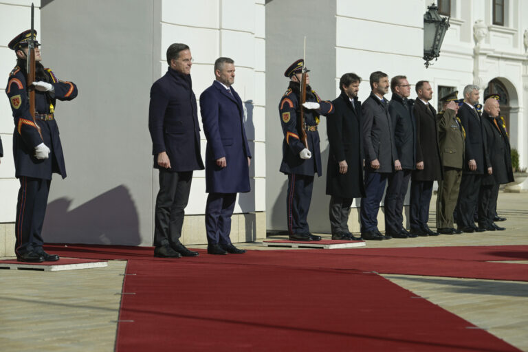 Zľava v popredí: Prezident SR Peter Pellegrini a generálny tajomník NATO Mark Rutte počas oficiálneho privítacieho ceremoniálu na nádvorí Prezidentského paláca v rámci prijatia generálneho tajomníka NATO prezidentom SR v Prezidentskom paláci. Bratislava, 20. február 2025. Foto: SITA/Milan Illík