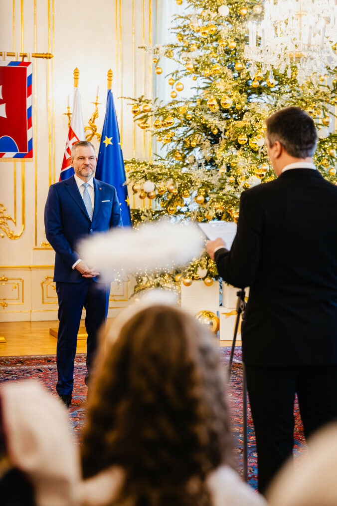 Prezident SR Peter Pellegrini (v popredí) počas prijatia koledníkov Dobrej noviny v Prezidentskom paláci. Bratislava, 7. január 2025. Foto: SITA/Kancelária prezidenta SR
