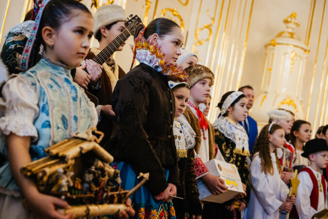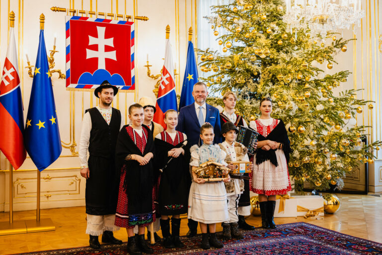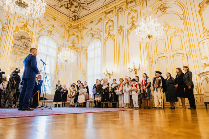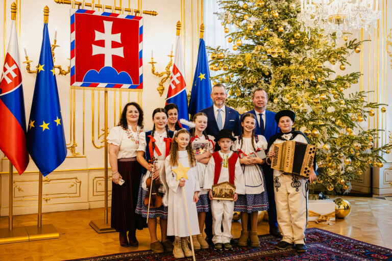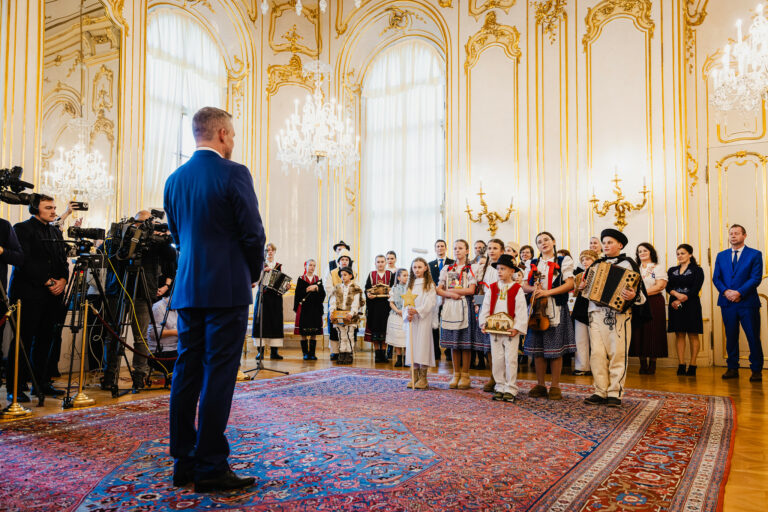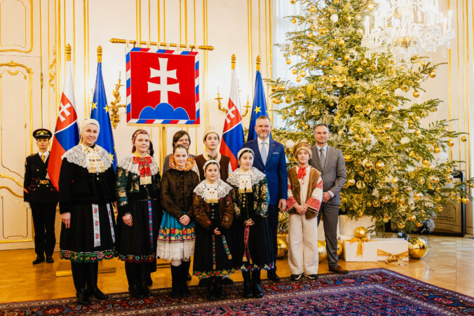 Prezident SR Peter Pellegrini (v pozadí, šiesty sprava) počas prijatia koledníkov Dobrej noviny v Prezidentskom paláci. Bratislava, 7. január 2025. Foto: SITA/Kancelária prezidenta SR