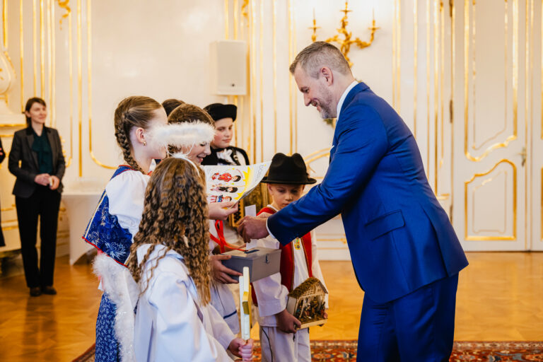 Prezident SR Peter Pellegrini (vpravo) počas prijatia koledníkov Dobrej noviny v Prezidentskom paláci. Bratislava, 7. január 2025. Foto: SITA/Kancelária prezidenta SR