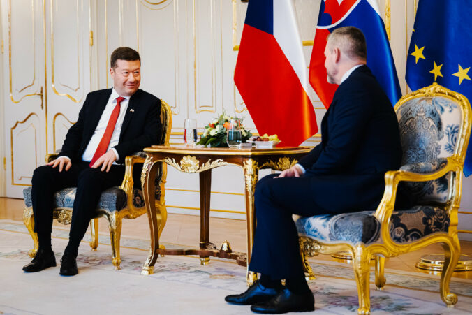 Sprava: Prezident SR Peter Pellegrini a predseda Poslaneckej snemovne Parlamentu Českej republiky Tomio Okamura počas prijatia nového predsedu Poslaneckej snemovne Česka prezidentom SR v Prezidentskom paláci. Bratislava, 2. december 2025. Foto: SITA/Kancelária prezidenta SR