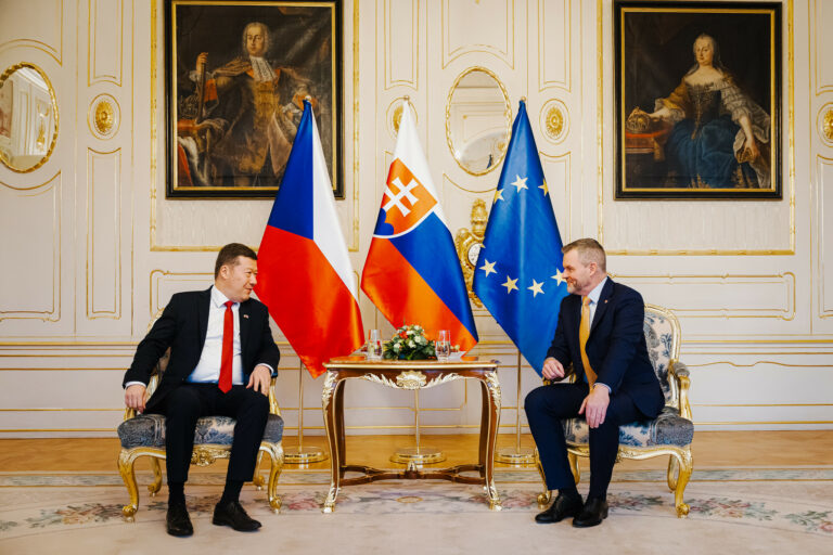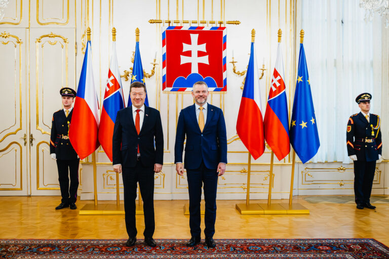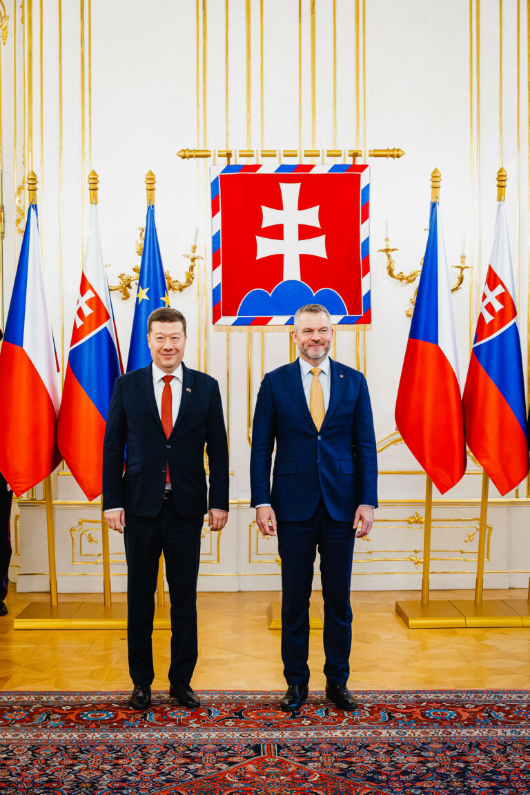 Uprostred sprava: Prezident SR Peter Pellegrini a predseda Poslaneckej snemovne Parlamentu Českej republiky Tomio Okamura počas prijatia nového predsedu Poslaneckej snemovne Česka prezidentom SR v Prezidentskom paláci. Bratislava, 2. december 2025. Foto: SITA/Kancelária prezidenta SR