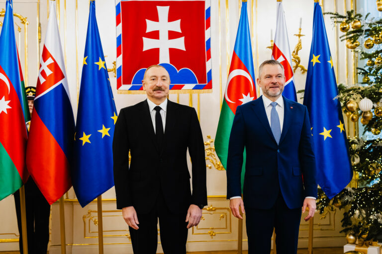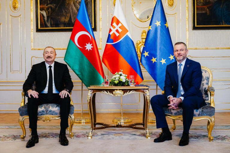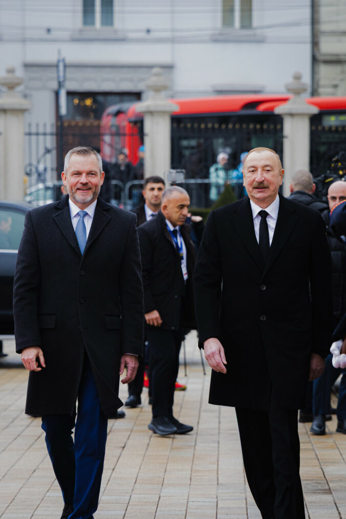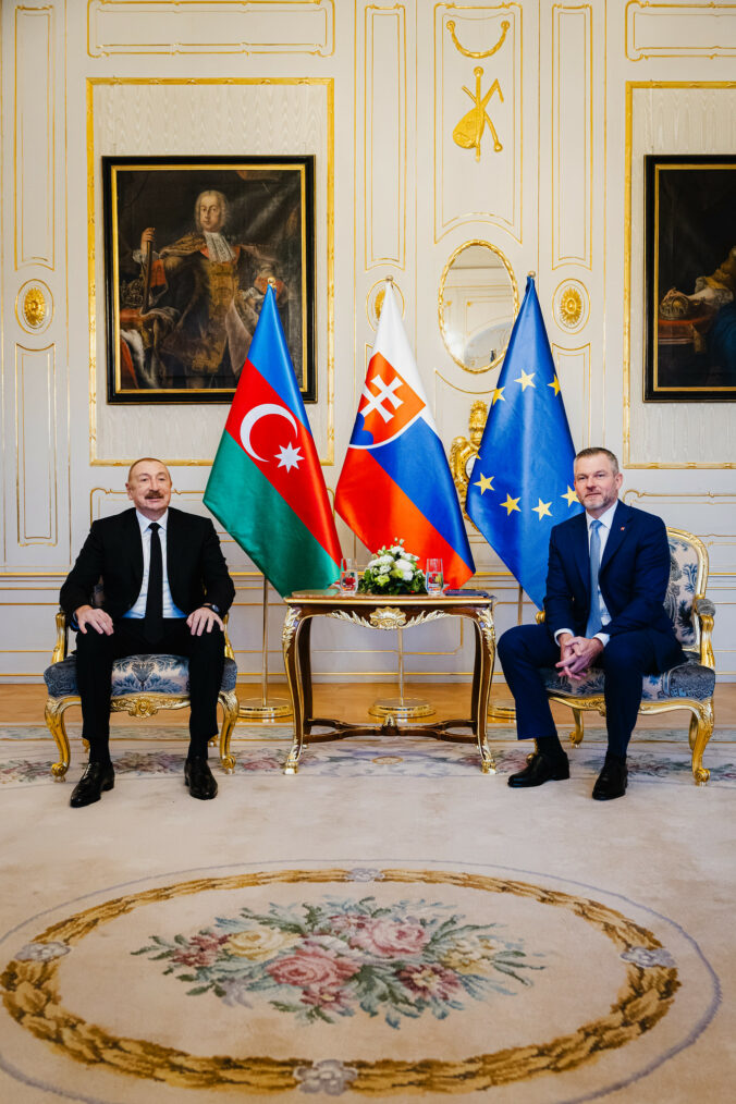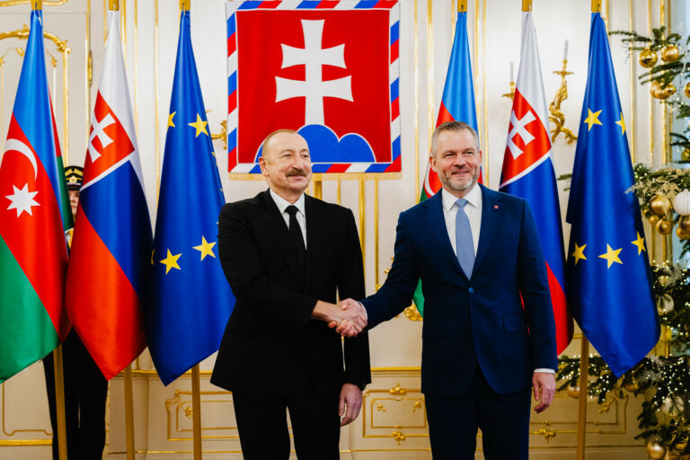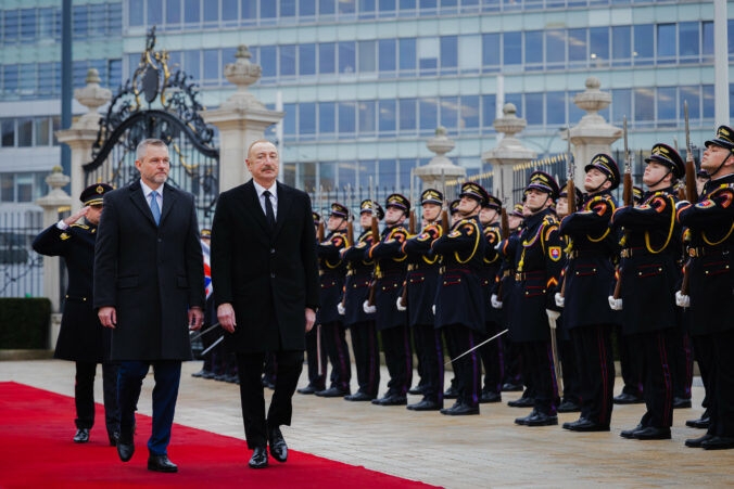 Zľava: Prezident SR Peter Pellegrini a prezident Azerbajdžanu Ilham Alijev počas prijatia azerbajdžanského prezidenta prezidentom Slovenska v Prezidentskom paláci. Bratislava, 8. december 2025. Foto: SITA/Kancelária prezidenta