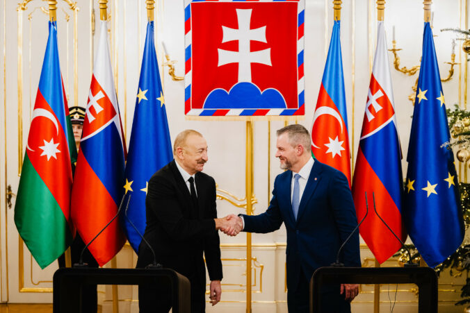 Sprava: Prezident SR Peter Pellegrini a prezident Azerbajdžanu Ilham Alijev počas prijatia v Prezidentskom paláci. Bratislava, 8. december 2025. Foto: SITA/Kancelária prezidenta