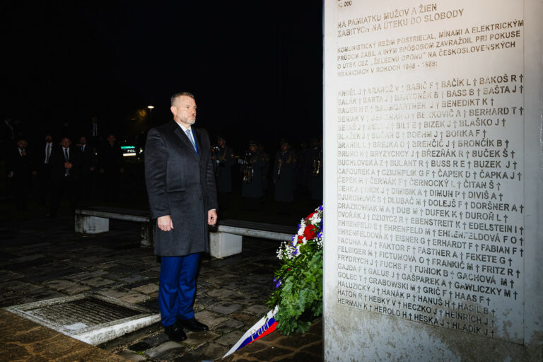 Prezident SR Peter Pellegrini počas položenia venca pri Bráne Slobody v Devíne v rámci návštevy azerbajdžanského prezidenta na Slovensku. Bratislava, 8. december 2025. Foto: SITA/Kancelária prezidenta