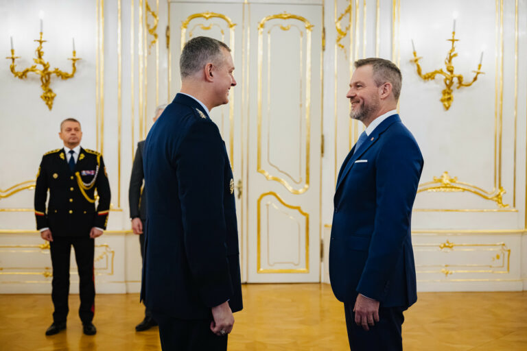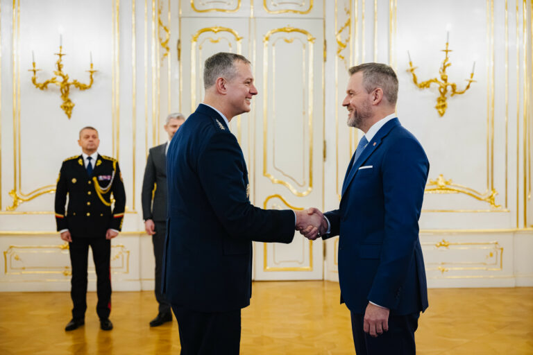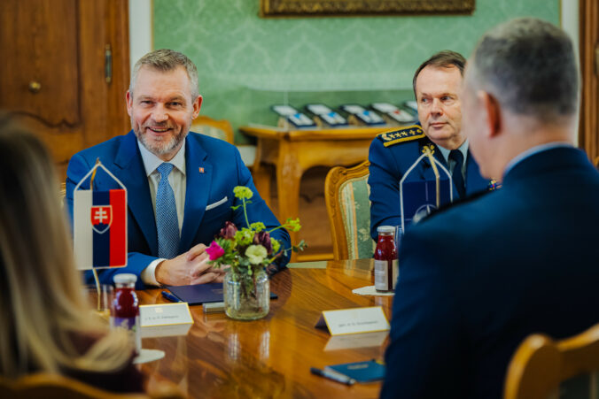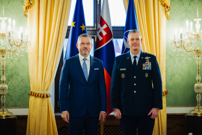 Zľava: Prezident SR Peter Pellegrini a vrchný veliteľ spojeneckých síl v Európe (SACEUR) Alexus G. Grynkewich počas prijatia v Prezidentskom paláci v rámci nástupnej návštevy najvyššieho veliteľa spojeneckých síl v Európe (SACEUR), na ktorej sa oboznamuje so špecifikami obrany SR a aktuálnym stavom plnenia spojeneckých záväzkov. Bratislava, 14. január 2026. Foto: SITA/Kancelária prezidenta SR