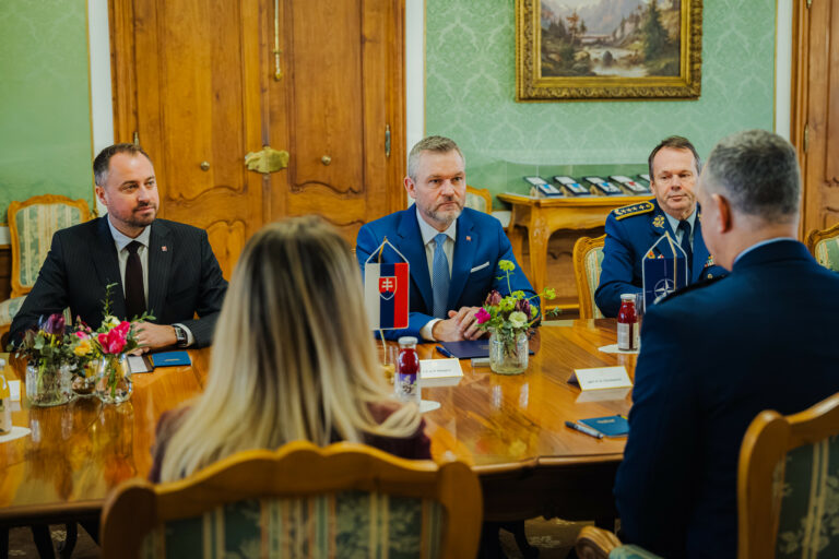 Vrchný veliteľ spojeneckých síl v Európe (SACEUR) Alexus G. Grynkewich (vpravo) a prezident SR Peter Pellegrini (tretí sprava) počas rokovania v Prezidentskom paláci v rámci nástupnej návštevy najvyššieho veliteľa spojeneckých síl v Európe (SACEUR), na ktorej sa oboznamuje so špecifikami obrany SR a aktuálnym stavom plnenia spojeneckých záväzkov. Bratislava, 14. január 2026. Foto: SITA/Kancelária prezidenta SR